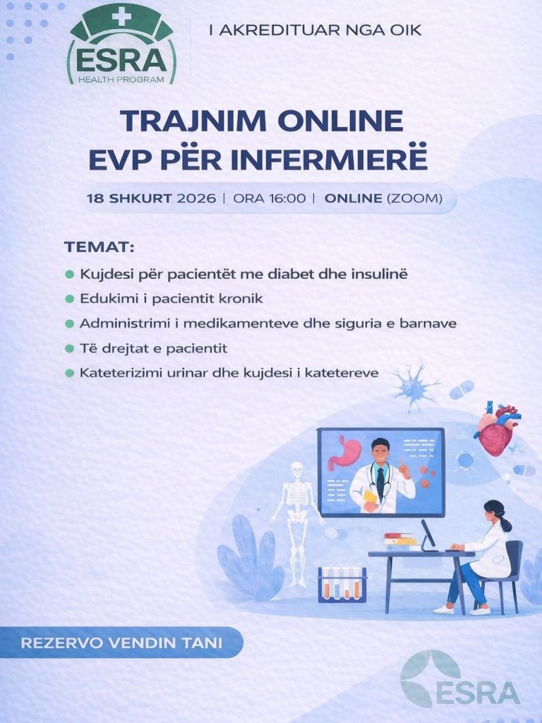 Environmental and Social Responsibility Association (ESRA) njofton hapjen e regjistrimeve për Trajnimin Online EVP për Infermierë, një trajnim profesional i akredituar nga Oda e Infermierëve të Kosovës (OIK), i cili do të mbahet më 18 shkurt 2026, duke filluar nga ora 16:00, në format online (Zoom).